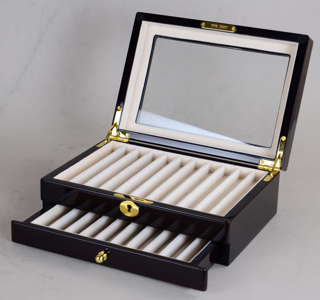 Wooden Pen box for 40 pens in Ebony exterior and Ivory interior. Exterior with MDF Veneer Sheet Acrylic Windows Interior with High Gloss Piano Finish and Luxury velvet linings. Dimensions: 270x190x95mm Capacity: 40 pens