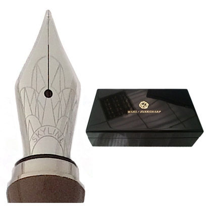 SKYLINE Award Collection – Palladium Award Color: Full palladium plated Cap: Palladium plated Clip and trim: Gold Plated Nib: Medium solid 18 Karat 2-tone nib Ink Filling System: Converter included or standard long Waterman style cartridge Literature: Wahl-Eversharp booklet and warranty card i ...